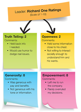 “Richard Two” was owner of consulting company I worked with early in my career in the field of organization and leadership development. Richard Two’s chief qualities were the opposite of Richard One’s. He was totally trustworthy because anything he had to say was truthful. He was open to sharing my good points with me; if there was constructive feedback to share, he delivered it clearly, at the right time and in an appropriate setting. Conversely, any time I wanted feedback or support he was ready to give it. He would never discuss my shortcomings with anyone but me. Regarding empowerment, he let me run my client engagements as I saw fit and generously rewarded me with a significant share of project margins. In terms of openness, he was willing to share his plans for the firm and invite suggestions for change. Again, you can look below for a description of how these values were measured.